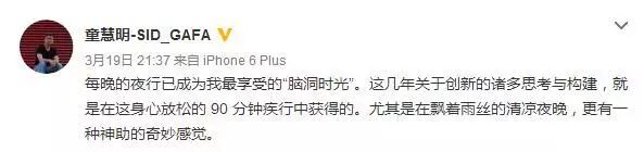 在近期的一条微博中,童教授说道:“每晚的夜行已成为我最享受的‘脑洞时光’。这几年关于创新的诸多思考与构建,就是在这身心放松的90分钟疾行中获得的。尤其是在飘着雨丝的清凉夜晚,更有一种神助的奇妙感觉。”